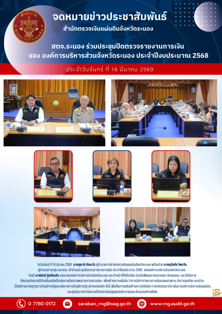 สำนักตรวจเงินแผ่นดินจังหวัดระนองร่วมประชุมปิดตรวจรายงานการเงิน ขององค์การบริหารส่วนจังหวัดระนอง ประจำปีงบประมาณ 2568กิจกรรมตรวจสอบ, ข่าวประชาสัมพันธ์, ภาพกิจกรรมมีนาคม 18, 2026มีนาคม 18, 2026 Post Views: 42